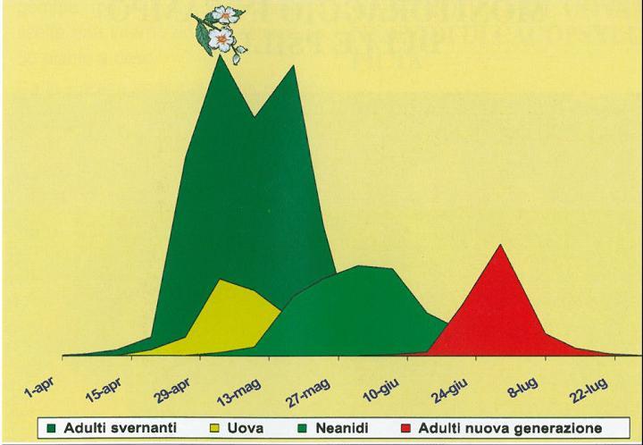 - ricorrere al controllo degli insetti vettori attraverso una difesa attiva: è necessario studiare e tenere sotto controllo il ciclo biologico della psilla per sapere quando è il momento per intervenire; di seguito è riportato il ciclo biologico della Cacopsylla melanoneura e C. picta: